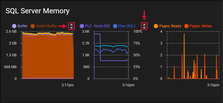 Some charts, such as SQL Server Activity and SQL Server Memory may have additional metrics available in the legend and filter dots. Use the arrows to scroll through them.
