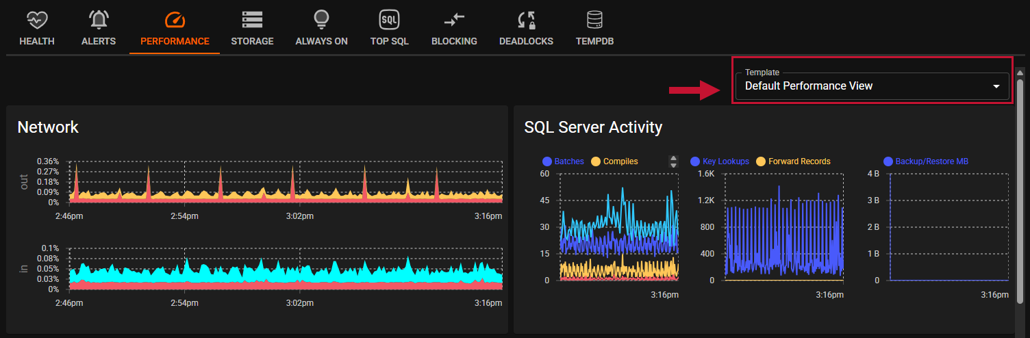 Click the Performance tab for any target type to load into the default Performance View with default widgets. Click the Template drop-down in the top right, and then click the desired custom template to change your view.