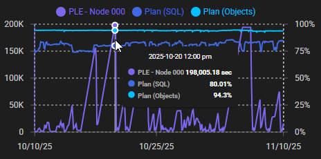 The average lifespan of a data page. If this value is less than 600, it's an indicator of memory pressure. Ideally, it should be much higher than 600 if ample memory is available. In general, the larger the buffer cache size, the higher it should be. This is the best universal indicator of memory pressure.