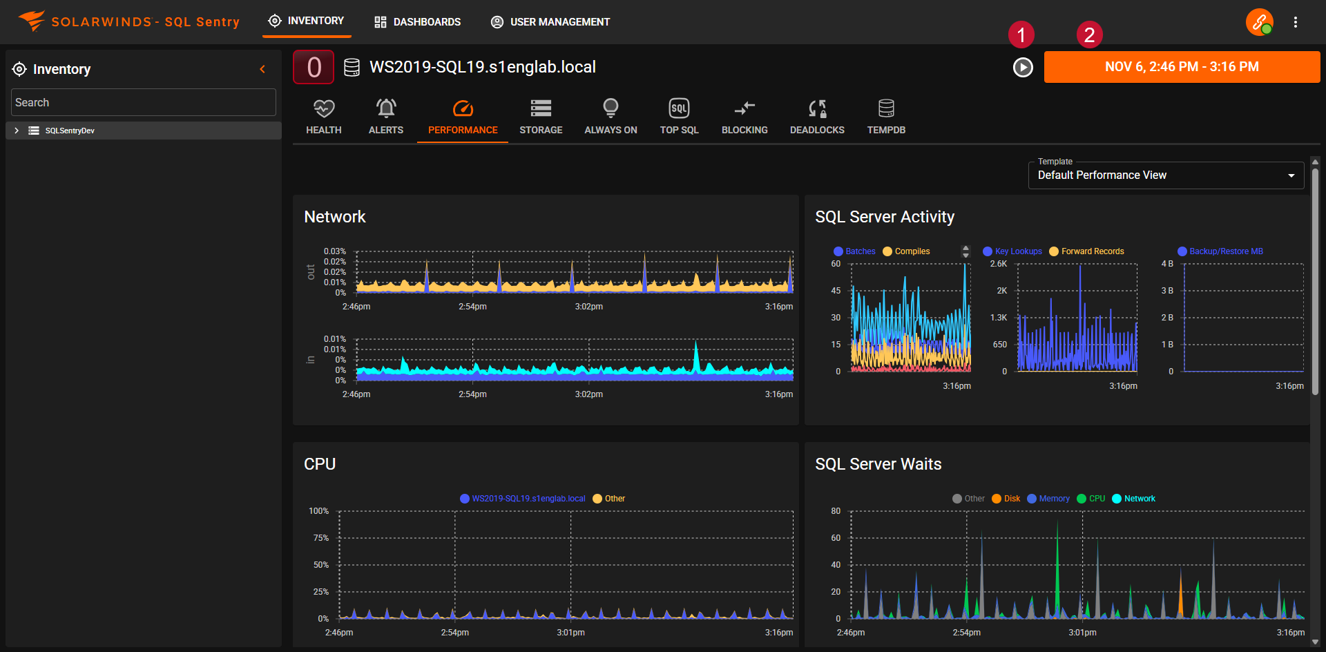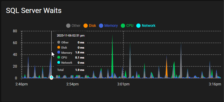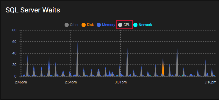 SQL Server Waits is one of the most important charts on the dashboard, because it provides an instant profile of the SQL Server and where it's spending the most time waiting for physical resources. If SQL Server are consistently low, then what the other dashboard charts are showing is less important. For example, if CPU and SQL Server Activity: Batches look unusually high, but CPU waits are low, then the server hardware is effectively handling the load.