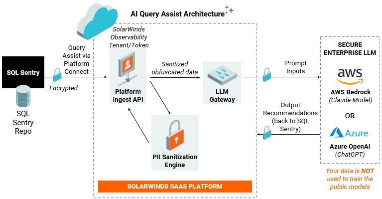 Users with admin privileges can select a query with an explain plan to send for optimization recommendations (as described in the following sections). Platform Connect is used to send the query and plan to SolarWinds Observability SaaS, where they are sanitized to mask any potential personally identifiable information (PPI). The sanitized data is then sent to a secure enterprise LLM, which returns suggestions for optimizing the query. Any user with read privileges can review the recommendations.