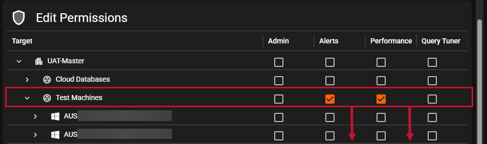 If a role is applied to a site within a site, then anything within that sub-site will inherit the role. For example, let's apply the Performance role to site UAT-TEST, (which is the within the Default Site UAT-Master). The user (or groups) will gain Performance role access to all targets within UAT-TEST, SQUADB-DEV.ENG.LOCAL,SQUADC-DEV.ENG.LOCAL,SQUADD-DEV.ENG.LOCAL) without gaining that additional access to other targets within UAT-Master.