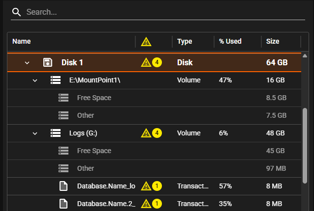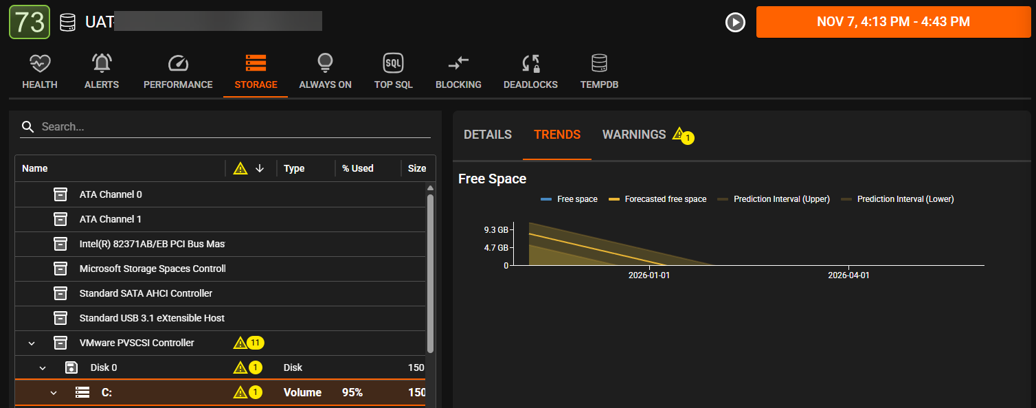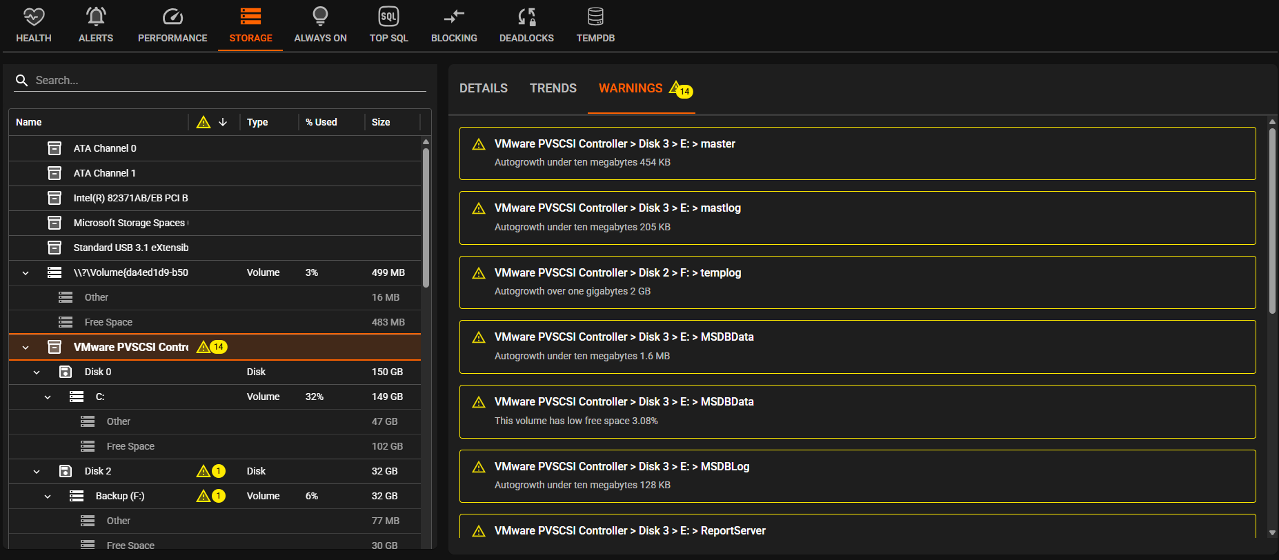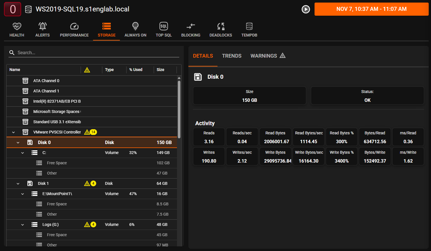 The Storage view provides details about the disk space and disk activity in your monitored environment. Use the Storage tab to view details about your monitored environment storage by disk, including capacity, free space, databases, disk activity, etc.