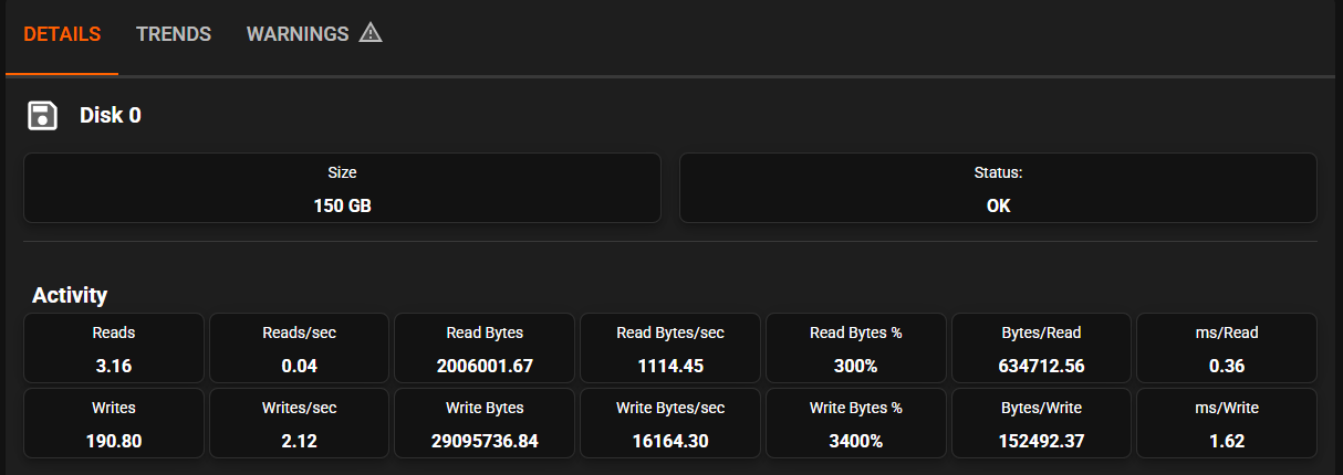View data about your monitored environment's disk activity and disk space. Selecting a link from the table on the left populates details for your selection on the right in the Details and Trends tabs.