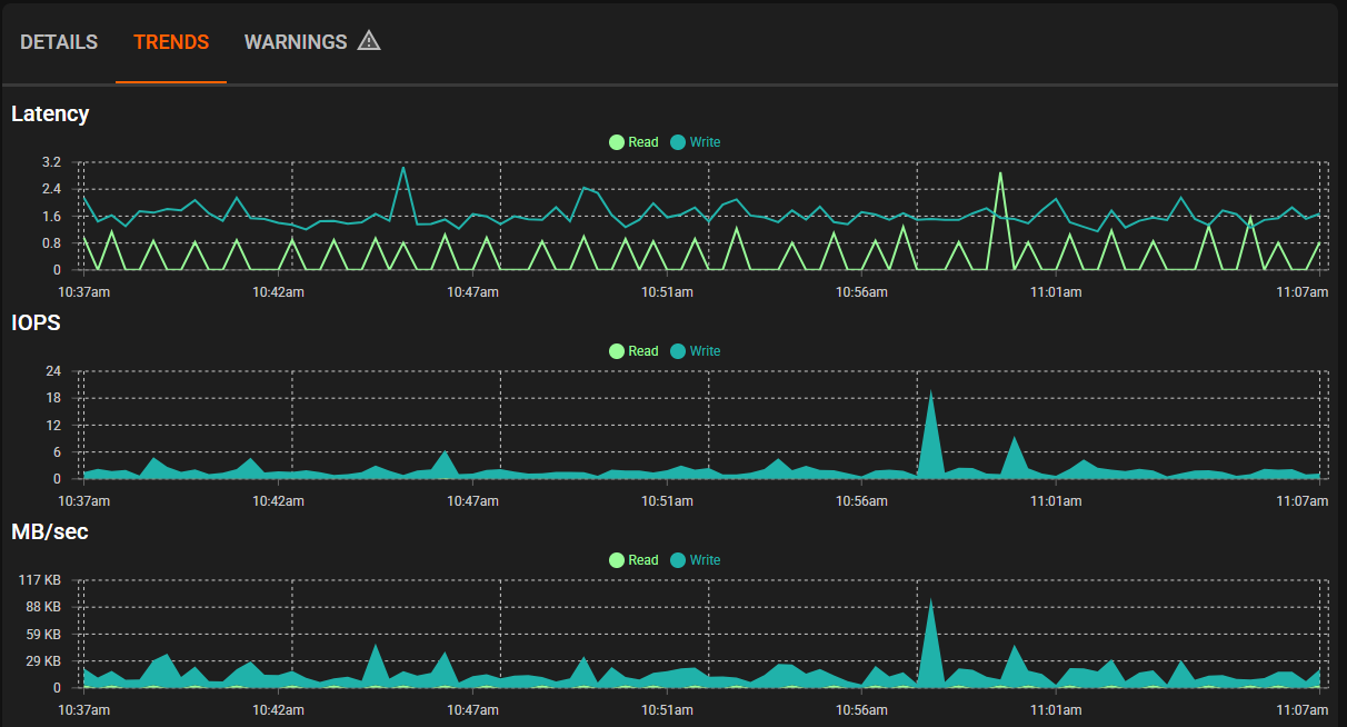 The Trends tab displays Latency, IOPS, and MB/sec graphs for your selected storage unit.