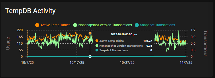 This chart provides a high-level view of the type and level of activity occurring in tempdb.