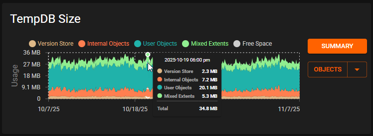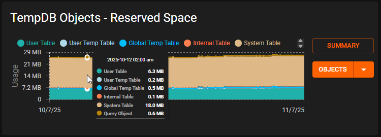 Note: Use the Objects > menu to view the TempDB Objects chart by Reserved Space, User Space, Row Count, or Object Count.
