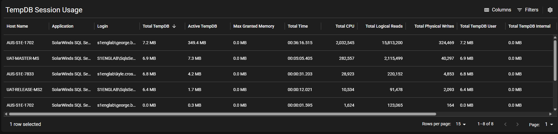 Note: The values in the TempDB Session Usage table represent the aggregated consumption over the time period in the top navigation bar, or highlighted time period from the TempDB Summary or TempDB Activity charts. Highlight a duration on either the charts and select Filter from the context menu to filter into a specific period of time.