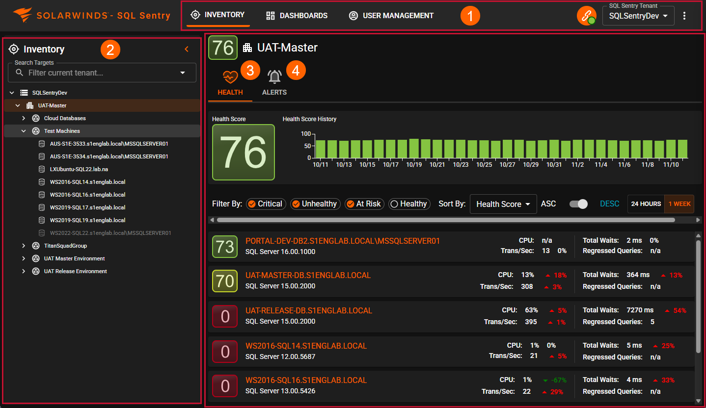 | 1. Inventory | The Inventory view is the default screen that displays health and alerts data for all of your monitored targets in SQL Sentry Portal. From the Health Overview, you can drill down into individual group or target views. |