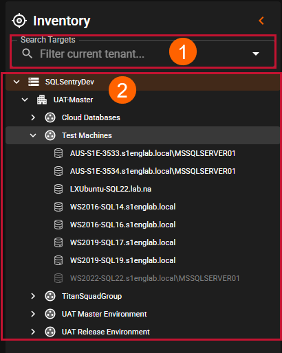 | 2. Sidebar | The Inventory sidebar has areas for monitored Targets and a search bar filtering specific targets. Full details are provided under the Sidebar section below. |