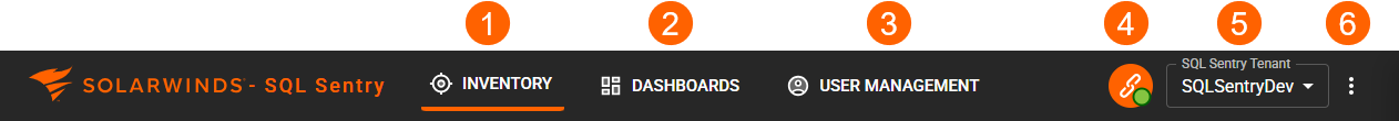 | 1. Navigation bar | Options for navigating between Inventory, Dashboards, and User Management pages. A multi-tenant drop-down selector that lets you jump between your tenants. Click the vertical ellipsis options menu to see options for a dark/light mode toggle, documentation link, SolarWinds support link, feature request link, and the SQL Sentry Portal version number. Full details are provided under the Navigation Bar section below. |