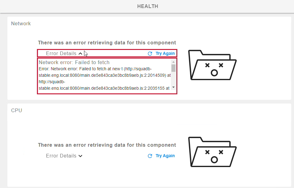 The Error Details chart displays a detailed log for the chart that failed to load properly. Select Error Details ^ to display the log information.