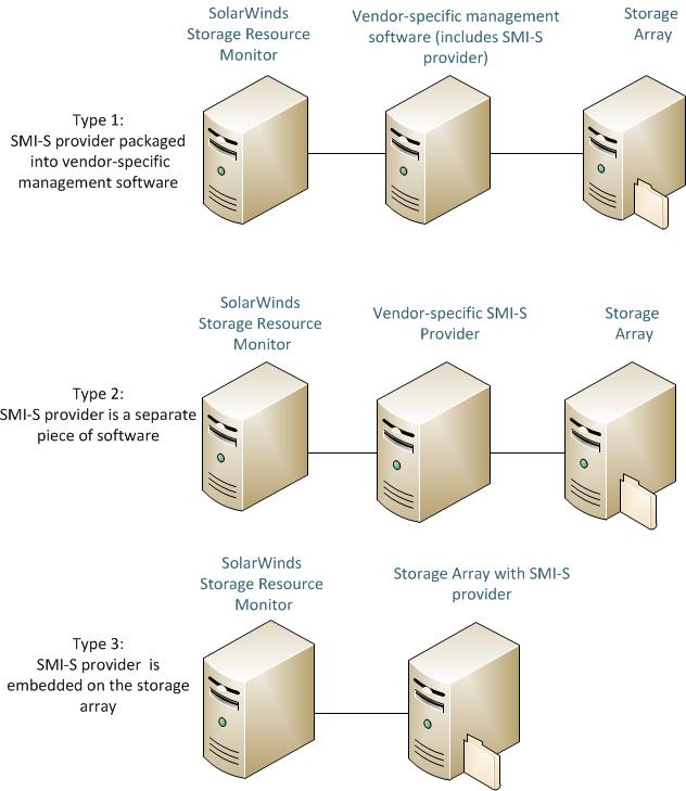 For a storage array to communicate with SRM, it is sometimes necessary for a provider to be installed. Depending on the vendor and the array model, the provider may be part of the management software provided with the array (Type 1 below) or a separate software application hosted from a server external to the array (Type 2) . In some cases the provider is already embedded on the storage array (Type 3). The following graphic demonstrates these three cases: