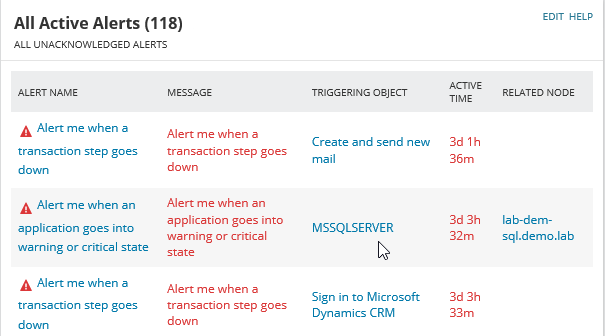 - Navigate to My Dashboards > Summary to display the All Active Alerts widget.