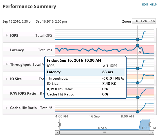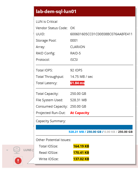 - Click the LUN icon to display the LUN details page. The Performance Summary widget shows the high latency.