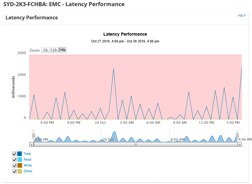 - Go to the Performance Summary widget for a more detailed view of this specific LUN's latency issues in relationship to other metrics. By moving the cursor over the chart, you can see all the performance metrics at any given time during the last 24 hours.