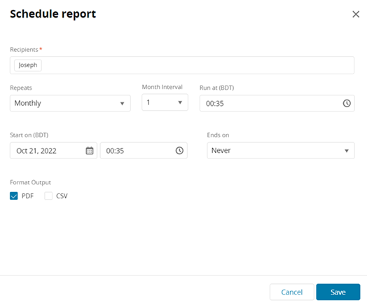 In the Schedule report dialog, provide recipients and time information, and then select output option(s), and then click Save.