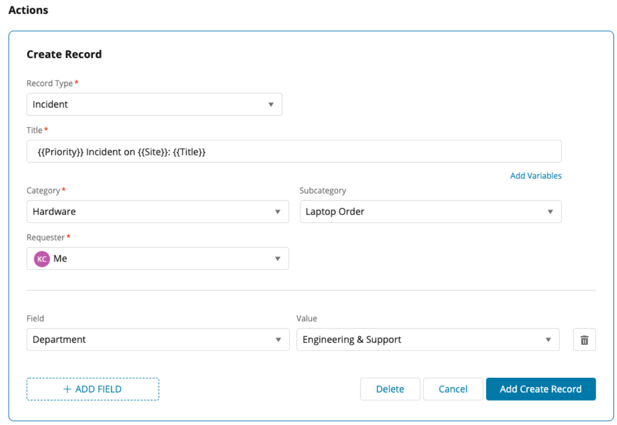- The Title has both a dynamic and static aspect. Notice the {{Title}} included in the default form. This ensures that the information will be pulled from the record that triggered the automation rule.