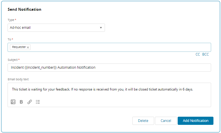 Many organizations implement a three-strike policy to ensure communication with the customer continues while an Incident or Service Request is open. You can set up an automation rule that sends out an email to the requester after a period of time to ask whether the customer still has the issue.