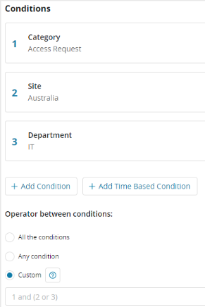 When you create a condition, Service Desk assigns it a condition number. You can then use the condition numbers to customize which must be met for an action to be triggered.