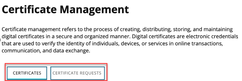 The Certificates management page provides two types of information. Select the appropriate tab to switch between them.