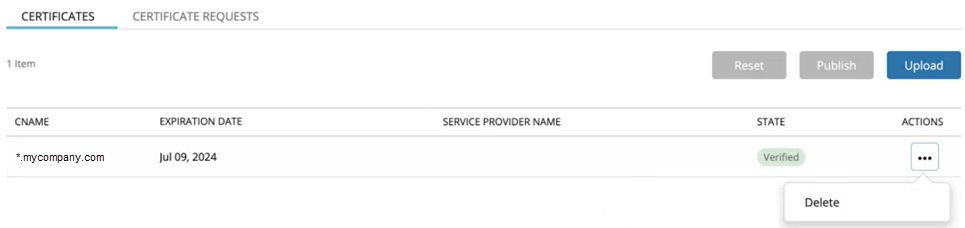 The Certificates tab provides a list of all your certificates. This includes those currently in use on your production environment and those you have uploaded as candidates for publishing and deleting.
