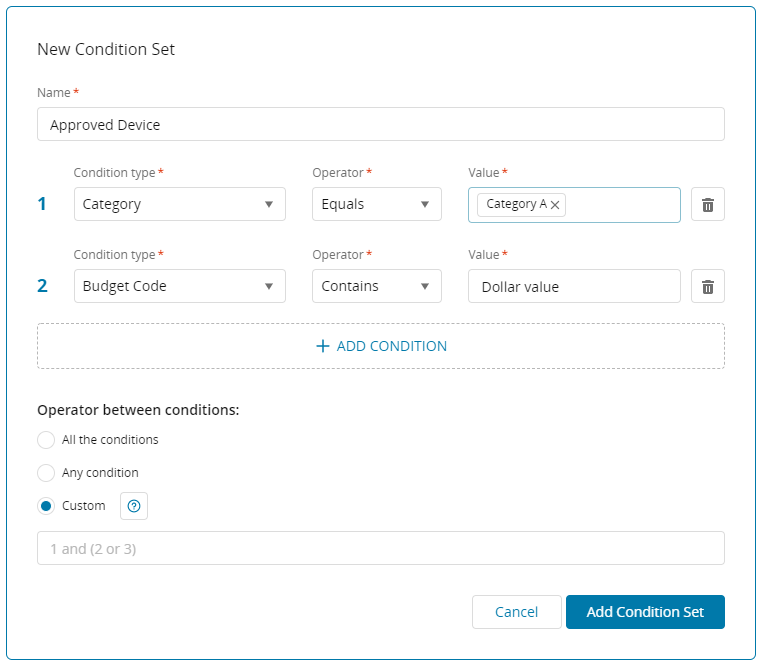 - Condition Set. Add a new Condition to any record field (including custom fields) in a process workflow and add a value to the pre-existing process. By applying a condition you enhance customization of your workflows and increase automation of processes to ensure overall efficiency.