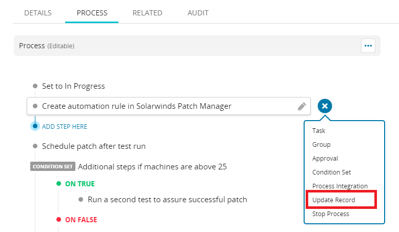 Hover over any part of the process to reveal the Add  icon. Click and select Update Record.
