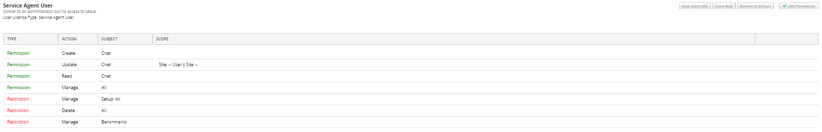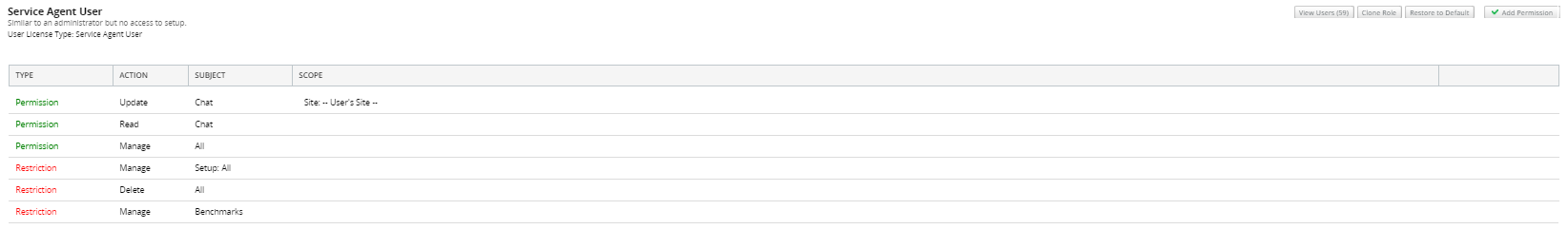 You can further customize the chat permissions by including site specifications. An agent who only needs to accept chats from a specific site (or sites) can have the following below. Notice the specifications in the Scope column.