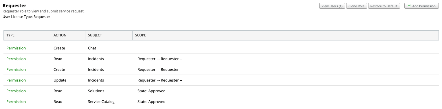 A requester who needs to be able to open a chat has the following permissions: