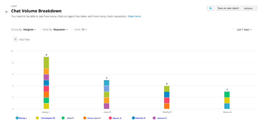 You can track the number of chats agents accept, the number of chats requesters start, and how many chats are generated by site or department.