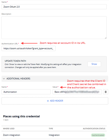 Create a meaningful name, add a description (optional), add an authentication URL, and create or update the token path. Additionally, you can use the body and headers to provide information such as an OAuth 2.0 Client ID and/or Client Secret.
