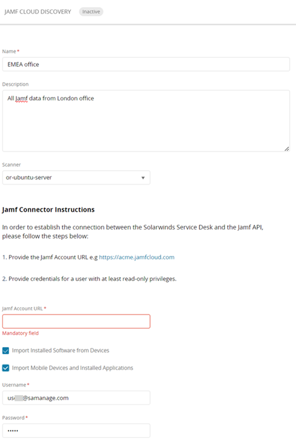 Use the information below to help in configuration. Field Description Cloud identification Jamf Pro organizational account URL. Authentication credentials Credentials for a user who has access to your Jamf Pro instance (read access is sufficient).
