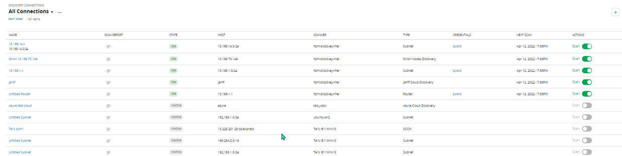 After a discovery scanner is installed, it detects the subnet on which it is deployed and automatically creates a new connection for the subnet. In addition, it detects the default router and automatically creates a new connection with the router. All additional SCCM, router, vCenters, subnets, nodes, and Cloud discovery on the network can be manually entered on the All Connections index page.
