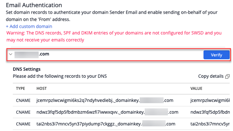 After you’ve added the CNAME records to your DNS, return to the Service Desk Email settings page (Setup > Account > Email Settings) and click Verify for the domain listed under email authentication.