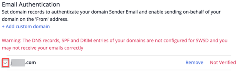 You can see the added custom domain listed under the email authentication section with a dropdown arrow. It is listed as Not verified.