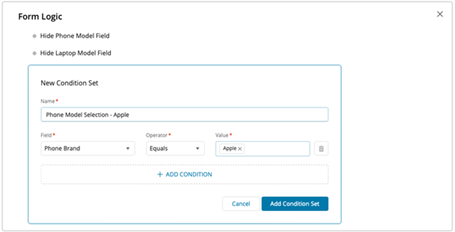 In the New Condition Set dialog, provide a name. This name is only visible in form logic for administration purposes. You can see all fields available in the system because the condition can look at fields outside of the current form.