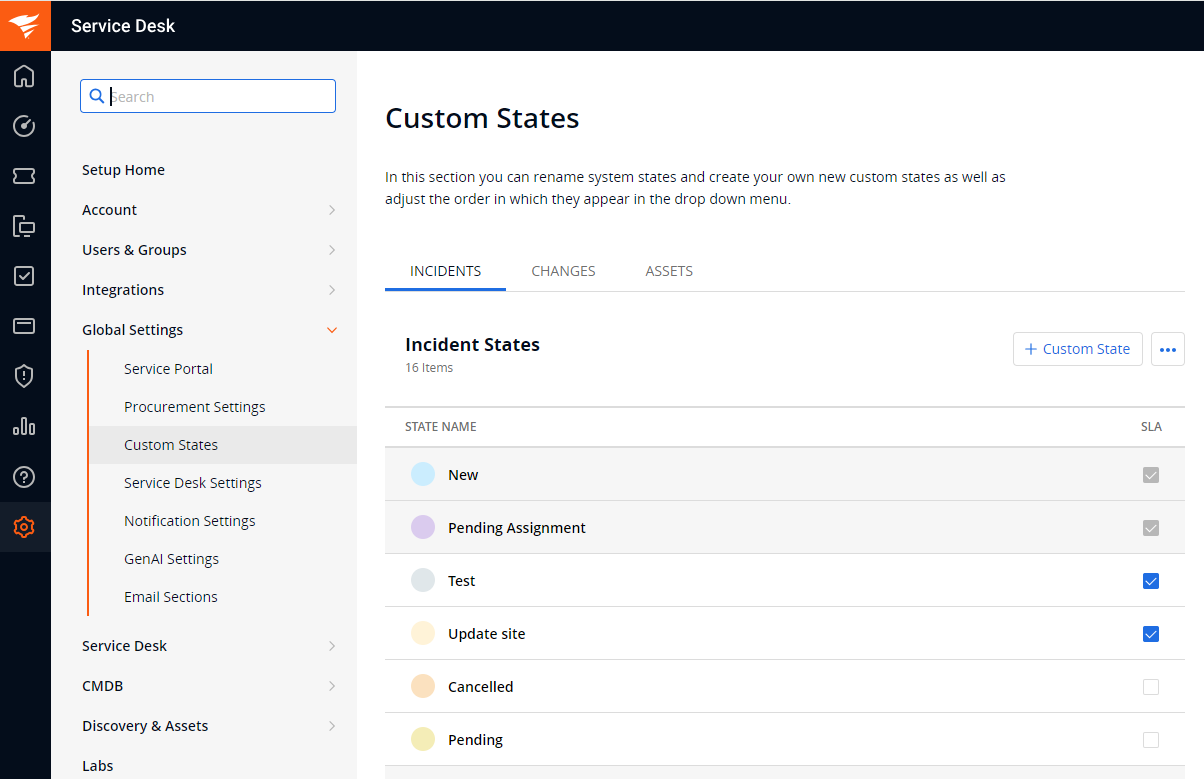 In Service Desk, custom states help to convey the progress or status of an incident or service request, change, or assets. You can expand the number of states available to you by creating states relevant to your organization in addition to using the out-of-the-box states provided by Service Desk. You can also rename system states and create your own new custom states as well as adjust the order in which they appear in the drop down menu using drag and drop.