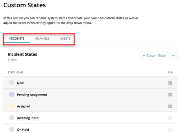 After navigating to Global Settings > Custom States, the Custom States screen displays. Tabs on that screen are Incidents, Changes, and Assets.