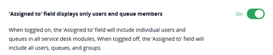 Scroll down in that section to locate 'Assigned to' field displays only users and queue members. Toggle the setting to On.