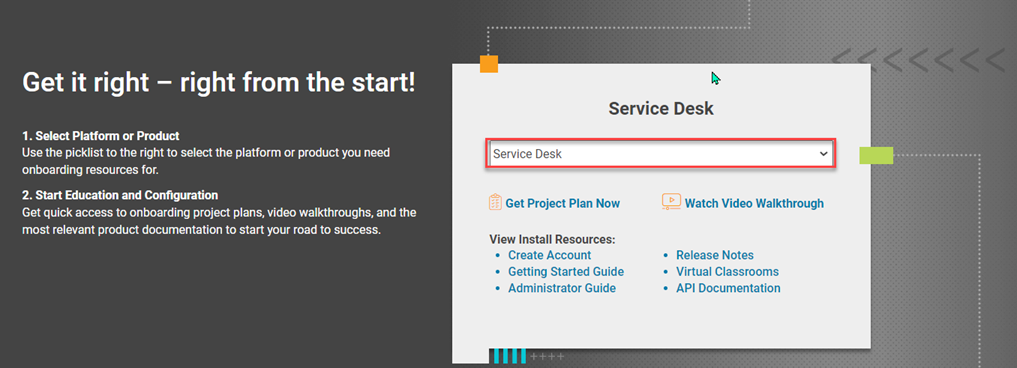 SmartStart Self-Led Onboarding provides useful guidance in getting started. Click the link to Self-Led Onboarding Resources, then select Service Desk as your product.