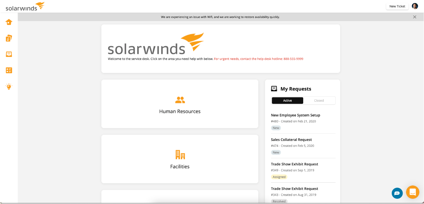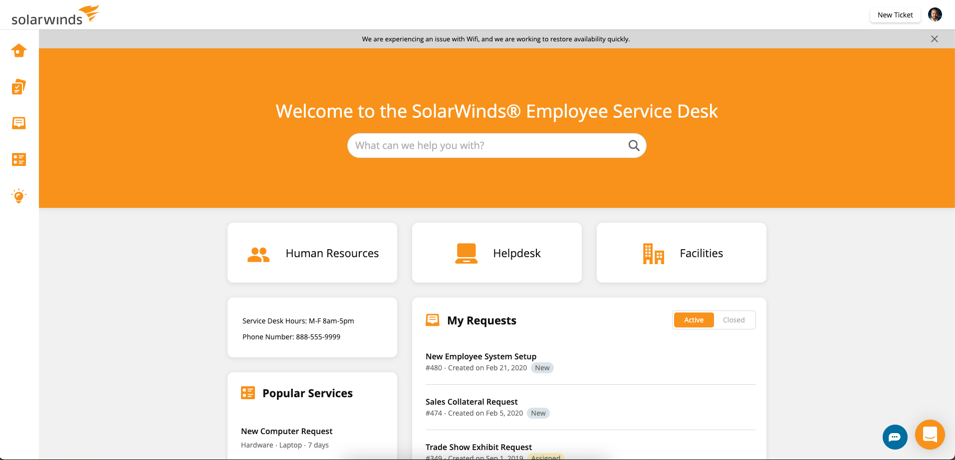 The Service Desk Service Portal is the place your end users should be able to quickly and easily find all they are looking for. With this in mind, SolarWinds wants to make sure you can arrange the page in a manner that suits you. The ability to design your portal home page is available for all Advanced and Premier packages. You can add your company branding and logo, and arrange widgets to meet the needs of your organization.