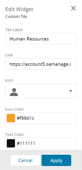 to further edit your view. The Edit Widget pane displays on the left allowing you to, label the title, include a link, add an icon, or change the icon color or text color.