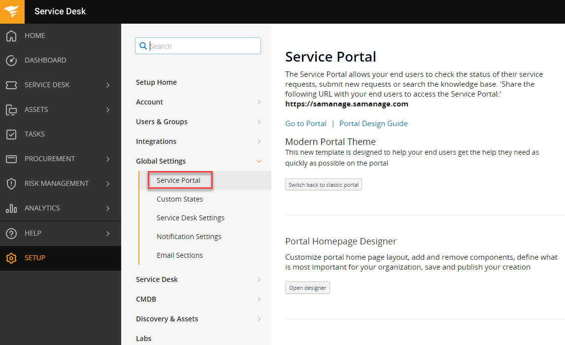 SolarWinds has provided pre-defined layouts that make it easy to design your page. See Service Portal settings and overview for a complete guide to the Service Portal.