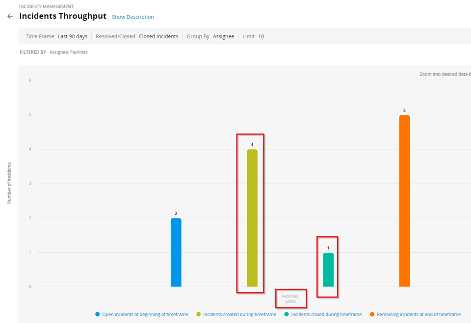 The percentage shown at the bottom is based on the number of incidents created during the time frame divided by the number of incidents closed during the time frame. For example, if the Facilities team had four (4) new incidents created and assigned during the last 90 days and they closed one (1), the Incidents closed during time frame would display 25% (1 is 25% of 4).