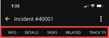 From the list of incidents, tap any incident to see information specific to that incident. Each incident has five tabs containing information the specific information.