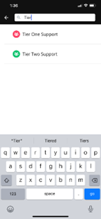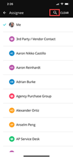 Reassign the ticket to another team or agent. Tap the current assignee and select the new assignee from the list that displays. You can also tap the magnifying glass in the black area at the top to search for a name or group. Tap current assignee Select new assignee Search for group