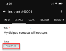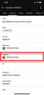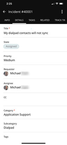 When you tap an incident to see more information, you can select the Details tab to see the title of the incident, state of the ticket, priority, requester, assignee, cc, category, subcategory, and tags.