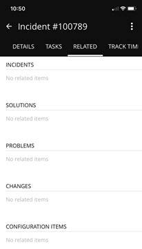 From the Related tab you can see information about other objects related to the open incident. These objects include incidents, solutions, problems, changes, and configuration items.