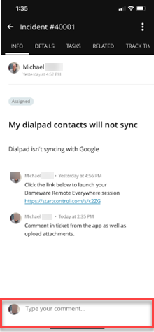 When you tap an incident to see more information, Service Desk defaults to the Info tab, which provides information such as the name of the assignee and the issue that needs to be addressed.